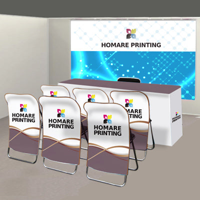 椅子に被せて使うチェアポップ6枚とテーブルに被せるだけのテーブルクロスと壁面を飾るタペストリーのセットです。企業イメージを伝える、会場のトータルデザインが簡単にできます。また、予算10万円内に収まり、1日だけの説明会や会員登録イベントに最適です。