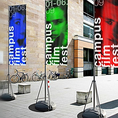 高さ4mの大型のぼり。屋外イベントや屋外スポーツ観戦会場などに最適! タンクに注水すれば安定感も抜群です。発色が綺麗な遮光ツイルに印刷します。