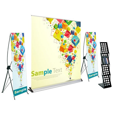 セット価格のとてもお得な商品です。XバナースタンドMタイプ2台と、カタログスタンド Zタイプ片面と、人気のロールアップ型バナーのクイックスクリーンエコノミ200のセットです。本体レンタル+印刷プランなら、予算12万円内に収まり、1日だけの展示会やイベントに最適です。